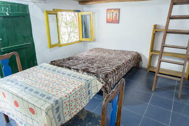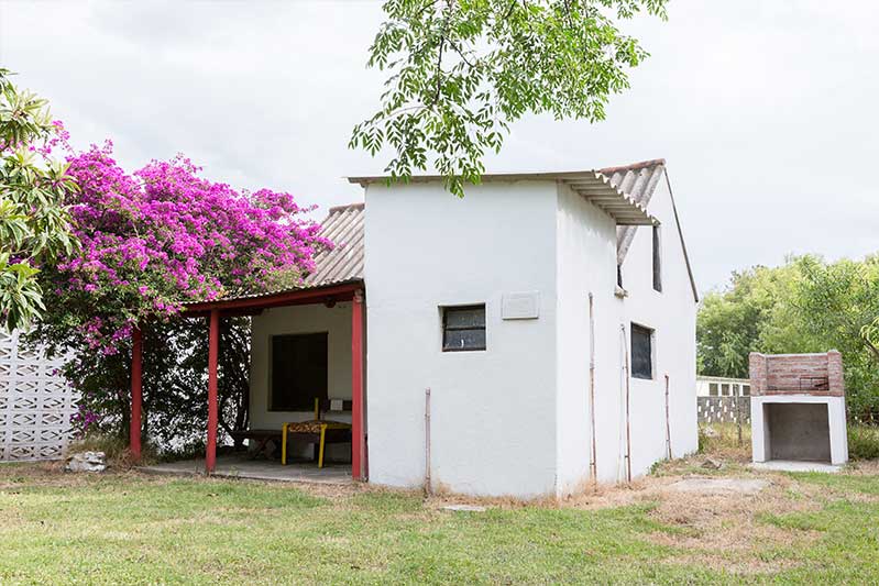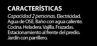 Amplio mono-ambiente, con una cama doble. Tiene un entrepiso a usar como baulera. Pertenece a un conjunto de seis casas. Es un predio arbolado de uso común en el cual cada cabaña posee un sector independiente con parrillero propio. Cuenta con estacionamiento en el frente del predio.